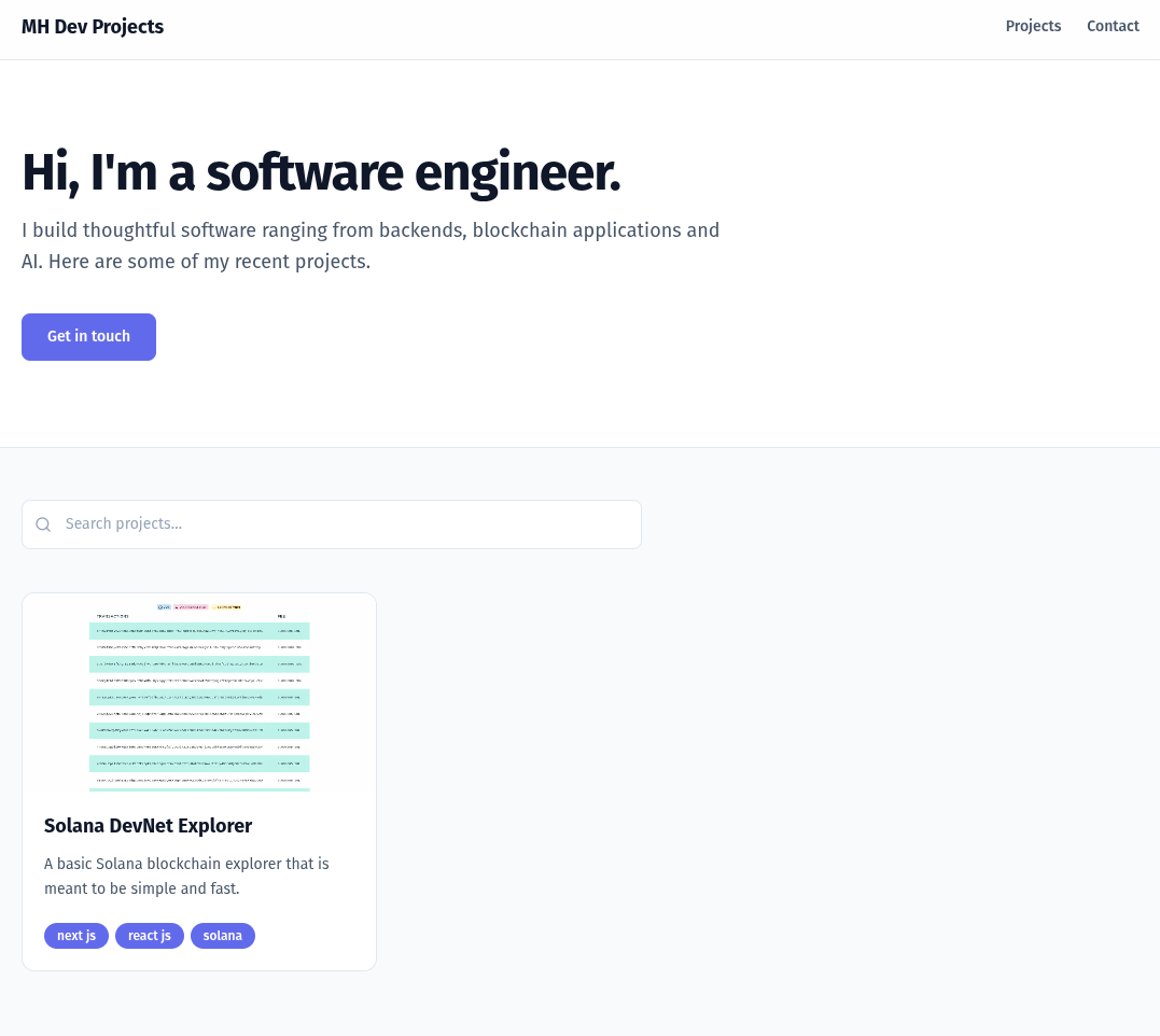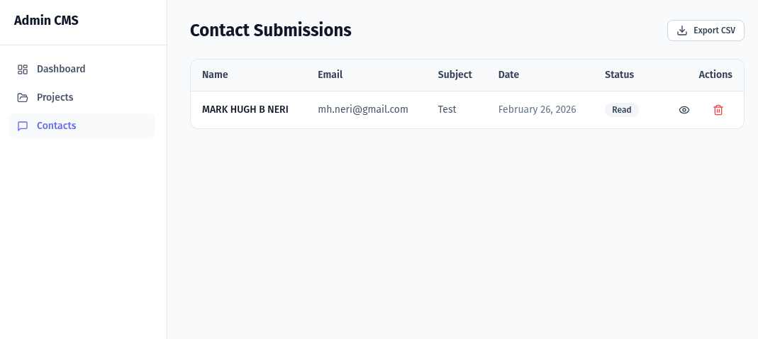 A full-stack portfolio site with a built-in CMS. Public pages showcase projects with search and filtering; the admin section provides a rich editor for managing content, screenshots, and contact submissions.